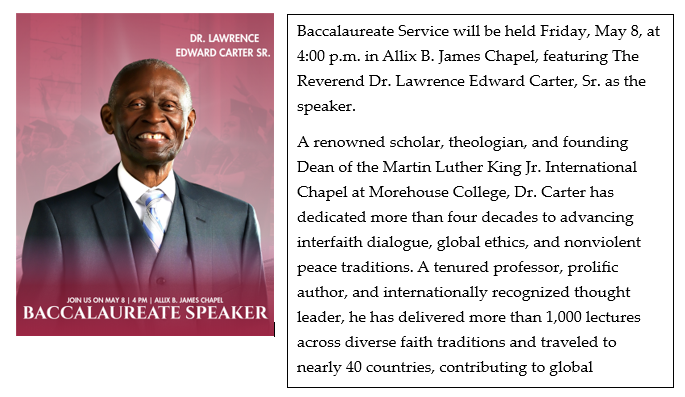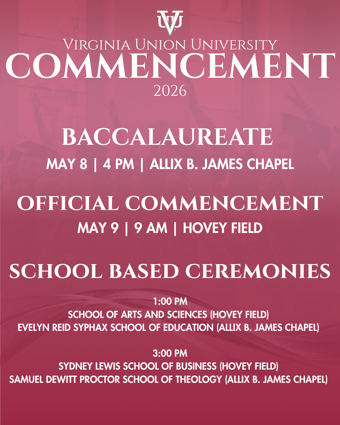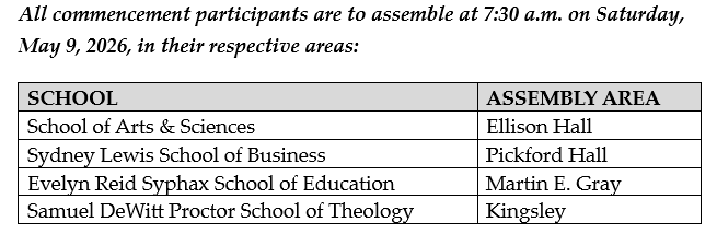 Baccalaureate and commencement at Virginia Union University are sacred ceremonies. As such, they are conducted with decorum, dignity, and pride. Appropriate academic regalia and accessories should complement the robe. The mortarboard is to be worn horizontally – not tilted. Appropriate attire is reflective of the importance of these occasions and is listed here: